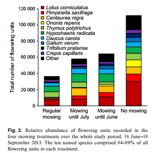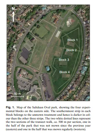 在2012年,研究人员将公园东侧的草地部分完全不割草(另一半仍继续被割草以供休闲使用)。从2013年春季开始,他们在那一半中指定了四个草块,将每个草块细分为四个较小的条带。每个条带采用不同的割草模式:一个在春季和夏季每两周割一次;两个在夏季的不同时间点割草;最后一个则完全不割草。