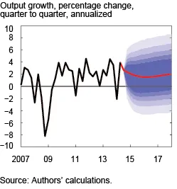 但纽约联邦储备银行的自由街博客上的一篇新 文章 清楚地表明经济学家实际上知道的很少。它不是预测一个特定的数字,而是展示了一系列可能的结果,从现在到未来扩展。这来自一个基于一种称为动态随机一般均衡的经济理论的经济计算机模型。(想了解更多关于DSGE模型的信息,请查看这个 五部分系列 在自由街博客上。)