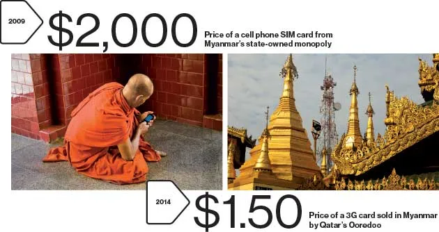 五年前,在缅甸购买一张手机SIM卡可能要花费超过2000美元。这是一种只有富人和关系良好的人才能享受的奢侈品——即使是他们也无法获得良好的信号。当时,缅甸刚刚开始摆脱军政府施加的数十年的孤立。只有朝鲜的人均手机数量更少。