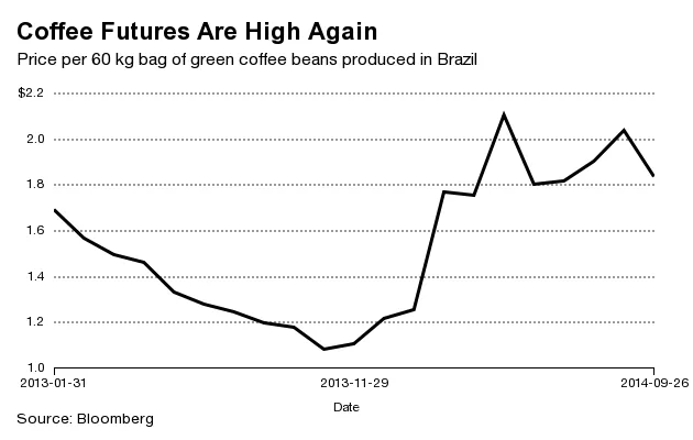 期货价格可能没有像2011年那样高,当时中美洲和哥伦比亚受到恶劣天气的严重影响,但情况并没有好转。国际咖啡组织预计在未来两年内会出现咖啡短缺。即使咖啡日的噱头今年让零售商花费更多,他们仍然渴望吸引顾客享用早餐,这是快餐行业最大的战场之一。