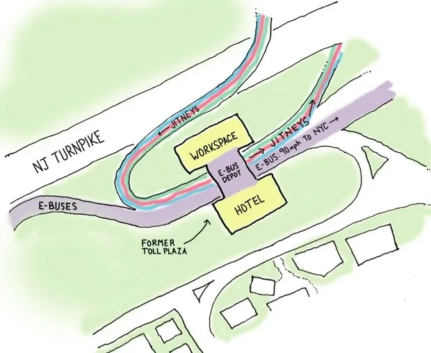 重大气候事件摧毁了新泽西的道路网络,但从废墟中出现了一个基于快速公交走廊的极其可持续的出行系统。通勤者可以按需安排快速公交旅行,或依赖大数据开发的预测时间表。郊区围绕位于可步行区域内的快速公交中心崩溃,附近设有共享单车站。私家车仍然存在,但它们的通行费很高,以支付快速公交的升级费用,前往纽约的通勤时间大幅减少。场景总结: