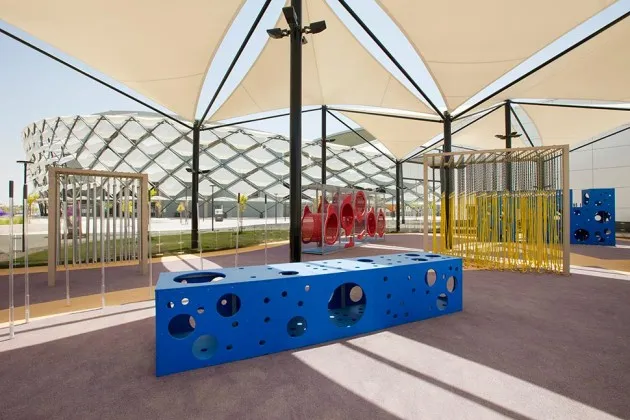 阿布扎比的自由游乐场儿童公园摄影:加布里埃拉·马杰在阿布扎比所有引人注目的建筑项目中,位于新开张的哈扎·本·扎耶德体育场外的游乐场是最不张扬的之一。必备的单杠、秋千、滑梯和沙箱被设计用于非结构化游戏而非规定活动的雕塑作品所取代。