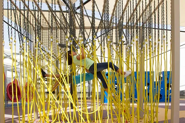 施赖布曼在2013年创立了他的公司自由游戏,在此之前与纽约设计公司LTL建筑师合作完成了四个独特的项目。所谓的玉米田是一组可以弯曲到地面但又轻轻弹回的垂直“茎”。它们可以配备内部灯光发光,施赖布曼表示他正在探索在其中安装传感器,以便在触摸时管道会发光。垂柳有效地颠倒了玉米田,形成了一片6.5英尺长的绳索丛,几乎垂到地面。孩子们可以在里面藏身,或者攀爬和荡秋千,或者在密集的海洋绳帘中藏身。