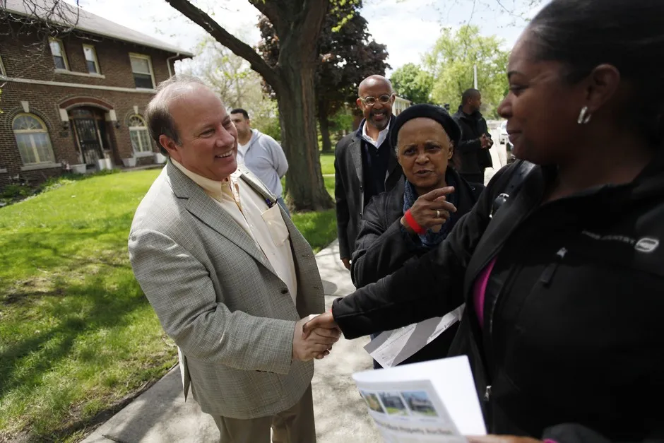 市长迈克·杜根访问底特律的波士顿爱迪生社区,参加2014年5月的房屋拍卖。路透社/约书亚·洛特“每个社区都有未来”是底特律市长迈克·杜根在2013年竞选时的口号。现在,在他任期的几个月里,很明显,他的信息——一个对底特律破产、削减的社会服务和高犯罪率的挑战——将是一个难以实施的任务。