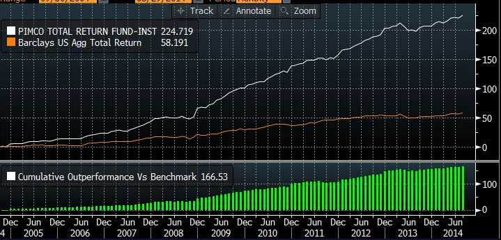 根据晨星的数据,如果你在1987年投资了10,000美元于Pimco总回报并让其增值,你将拥有81,000美元,而如果你投资于指数则只有60,500美元。在过去14年中,有9年该基金轻松超越了其基准。