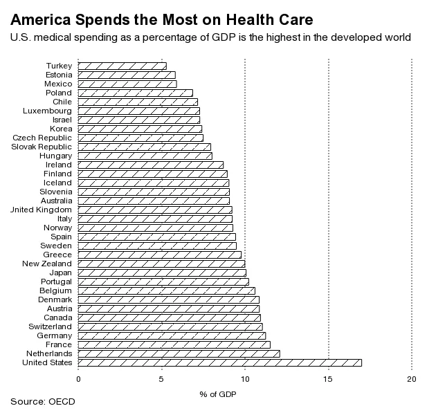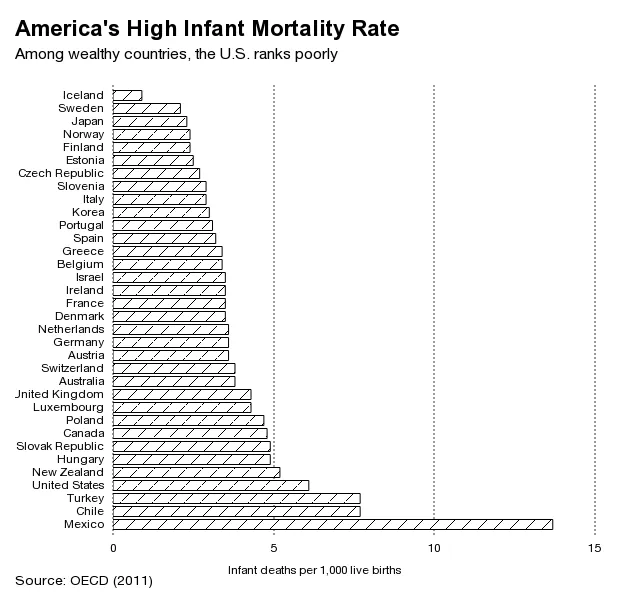 全球的死亡率约为34。在 欧盟中,这一数字为3.8。美国不仅落后于许多幸福指数排名靠前的北欧国家。意大利、葡萄牙和爱沙尼亚的婴儿死亡率都远远好于美国。尽管美国在医疗保健上的支出远高于其他地方。