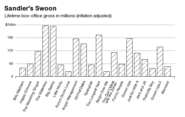 桑德勒的票房号召力在1990年代末达到顶峰,就像科技股一样,随着水男孩和大爸爸的上映而达到巅峰。经过通货膨胀调整,两部电影的总票房均超过2亿美元。