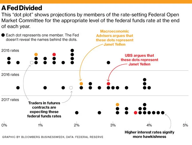 这对失业的美国人意味着耶伦并不是他们的超级英雄保护者。她认真对待让人们重返工作岗位,但她不会冒险让经济过热。2000年,当格林斯潘掌管美联储时,失业率一度降至3.8%。雇主们迫切需要帮助,以至于他们雇佣了前罪犯、无技能者、长期失业者和一些他们可能更愿意避免的少数族裔。上升的潮水确实提升了所有船只,但工资通胀上升至3.5%。紧张的美联储将联邦基金利率提高至6.5%——并且轻微的衰退在2001年开始。根据FOMC成员最新的经济预测,任何成员认为与低且稳定的通胀相一致的最低失业率是5%。 投资者尚未理解耶伦的美联储将在未来几年内大幅提高利率的概念。他们似乎集体不相信点阵图,该图显示中位数美联储投票者希望到2015年底联邦基金利率接近1.5%,到2016年底大约为3%。根据彭博社汇编的数据,联邦基金期货市场的交易者预计到2015年底利率将低于1%,到2016年底将低于2%。