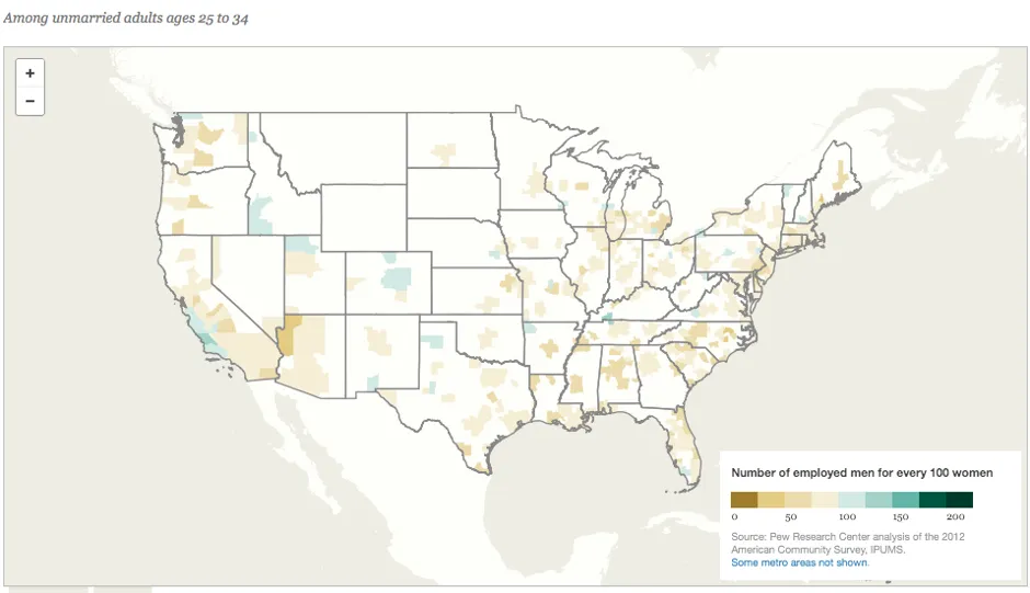 女性的“婚姻市场”按地铁划分。皮尤研究中心厌倦在Tinder上向左滑的女性可能想考虑搬家。说真的。如果你在寻找那个对的人(为什么不使用Tinder来完成这个任务呢?)——你搜索的地点至关重要。