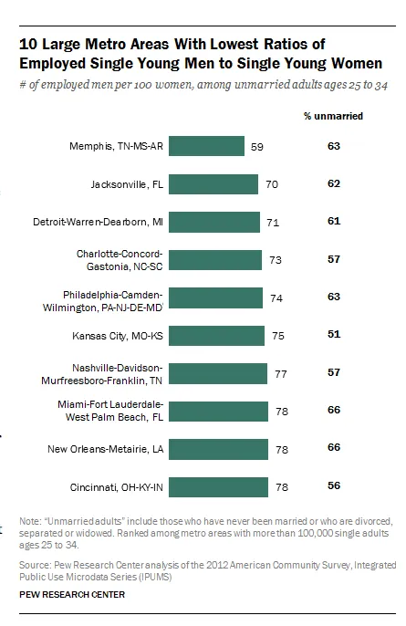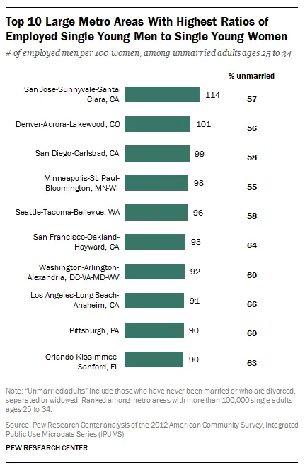 如果你是想结婚的女性,可以考虑搬到这些城市。皮尤研究中心但就是这样。在名单上的其他城市中,单身、就业男性的数量在每100名未婚女性中降到100以下。因此,单身女性在这些城市似乎面临着不利的局面。