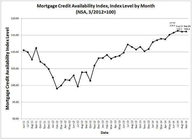 这不是显示伯南克和我们其他人面临的挑战的图表。它显示如今获得抵押贷款实际上更容易。抵押贷款信贷可获得性指数上个月已上升至约116,而2012年约为100。很难看出所有的争论是什么。