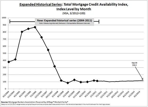 当你退后一步,观察更长的时间段时,问题就变得明显了。下面的图表显示了为什么连本·伯南克都无法再融资他的抵押贷款。它显示抵押贷款的可获得性从2004年的正常水平到2006年的极度宽松,再到此后的极度紧缩。第一张图表中似乎非常突出的可获得性在第二张图表中几乎不可见。