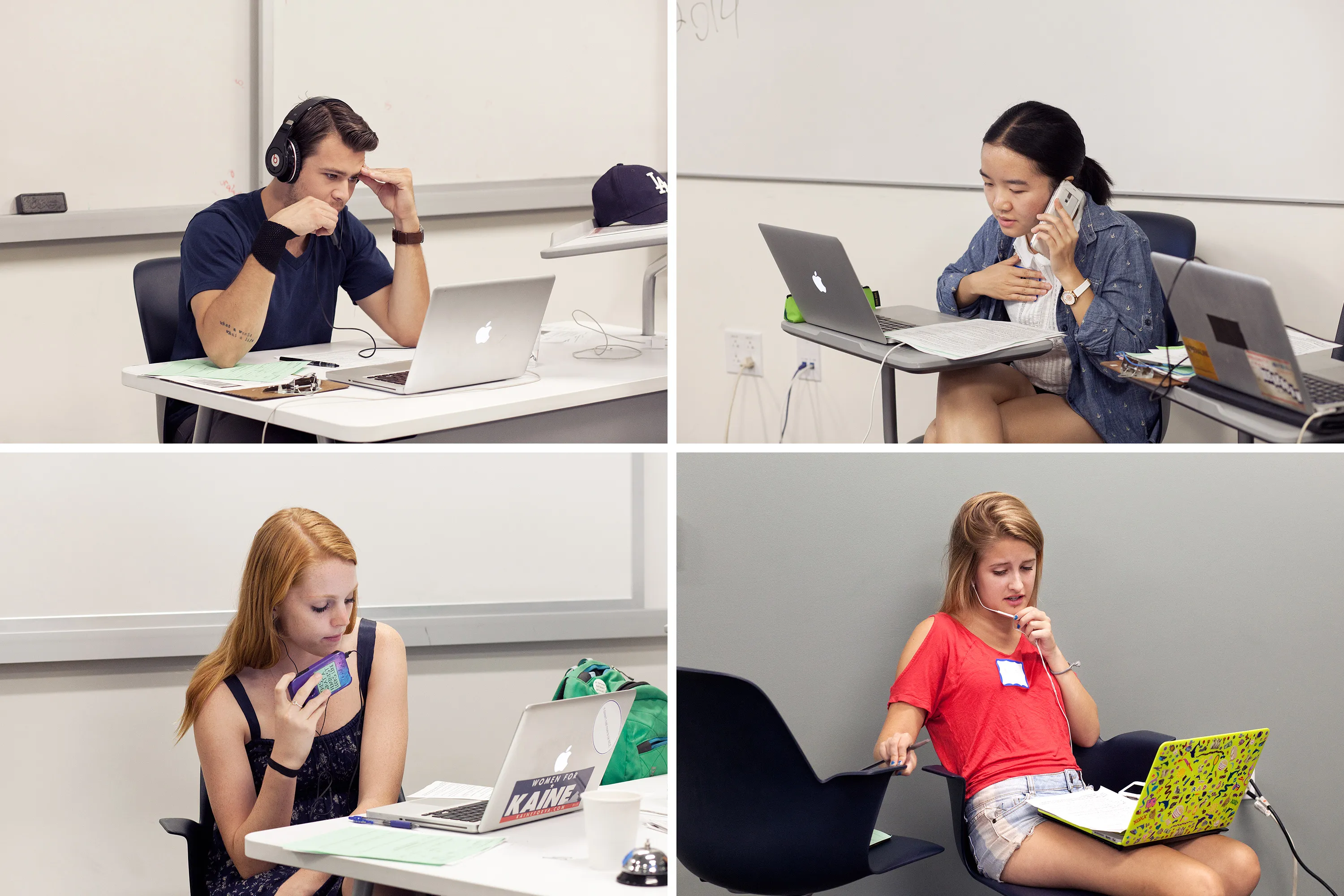 2014年10月4日在洛杉矶的电话银行拉票者。计划生育通常会派遣志愿者向与其目标一致的人 soliciting 贡献,或注册和动员已经在其阵营中的选民。但这些策略正在改变。摄影师:约翰·弗朗西斯·彼得斯/彭博社一份夹在夹板上的脚本提供了一些指导。 canvassers 应该首先询问选民在1到10的范围内评估他们对同性婚姻的支持程度。对于那些自我评估低于10的人, canvasser 的任务是探查抵制或矛盾的性质。组织者维吉尼亚·米拉奇指示他们通过倾听和分享将对话引导到新领域。“通过做自己与选民建立融洽关系,”米拉奇建议道。“当我们对选民表现出脆弱时,真的会有很好的回报。”