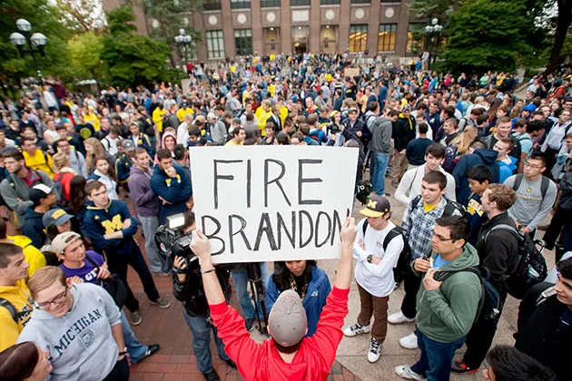 一名学生在密歇根大学校园内的抗议活动中举着“解雇布兰登”的标语,抗议最近与明尼苏达的足球比赛中四分卫肖恩·莫里斯在受到脑震荡后仍被留在场上摄影:大卫·古拉尼克/底特律新闻通过美联社照片