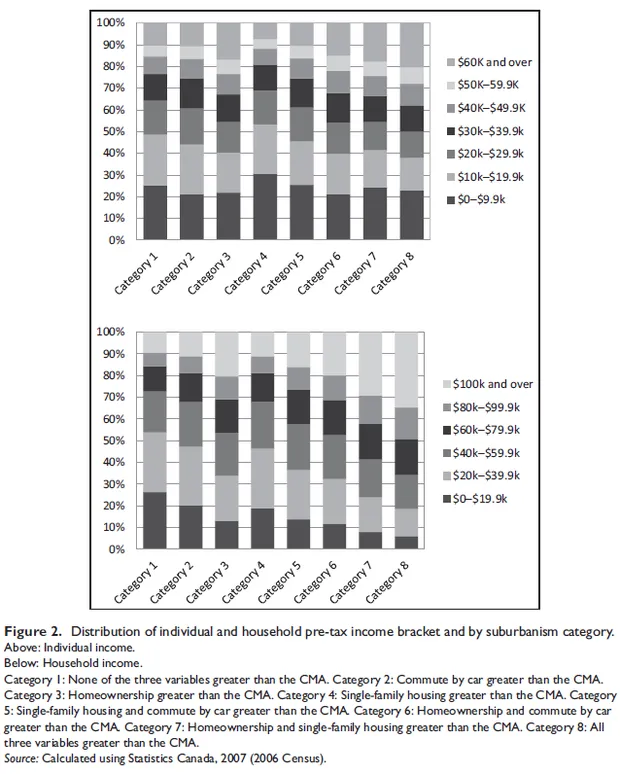 随着富人重新回到城市,他们带来了对购买更大房屋或公寓和私家车的偏好和能力。研究人员发现,加拿大大都市区的大多数人口居住在光谱两端的两种类型的社区中。根据具体的大都市,CMA居民中有三分之一到超过一半(具体取决于特定大都市)生活在类别8社区,即最郊区化的社区。另一方面,居民中有13%到33%(同样,具体取决于特定大都市)生活在类别1社区,即最城市化的社区。