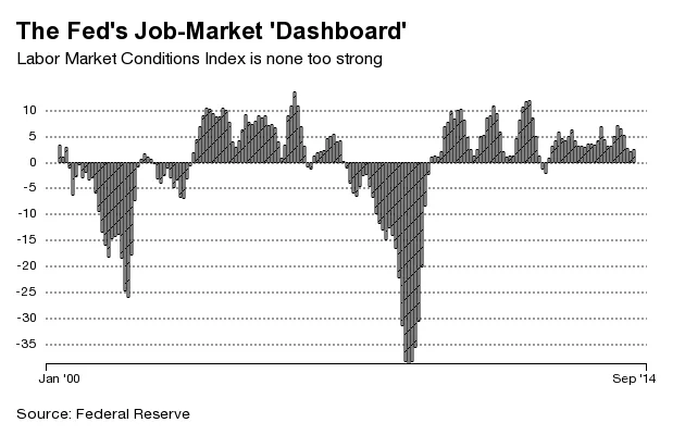 更新后的劳动市场状况指数稍微抑制了热情,因为劳工统计局的报告显示,9月份失业率降至5.9%,是六年来的最低水平。联邦储备委员会表示,9月份的指数为2.5,略强于8月份的2.0,但弱于自2012年7月以来的任何其他月份。