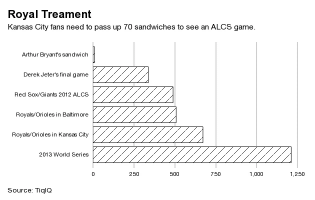 在二级市场上,用同样的钱,堪萨斯城的体育迷可以带16个朋友去观看当地的职业足球队Sporting KC的主场比赛。或者购买11张下一个酋长队主场足球比赛的票。或者带着五个人去看即将巡演的摩门经的音乐剧。或者在当地的BBQ机构亚瑟·布莱恩特的地方点70个熏火鸡三明治。