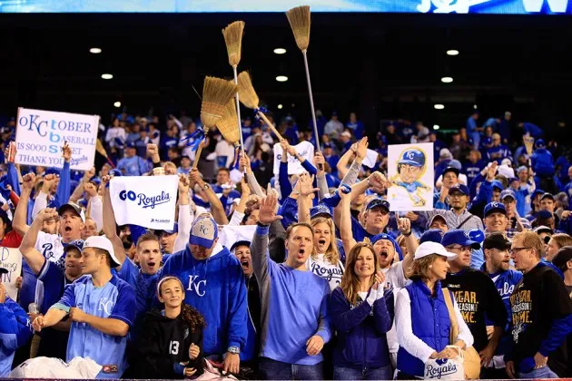 堪萨斯城的球迷在周日皇家队击败洛杉矶天使队后庆祝摄影:杰米·斯奎尔/盖蒂图片社在巴尔的摩和堪萨斯城,享受棒球荣耀的机会非常稀少——就像大多数短缺的东西一样,非常昂贵。