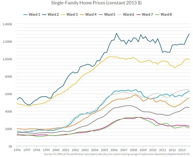 让我们快速看一下报告中几个更令人震惊的可视化图表。下面是一个图表,追踪自2000年华盛顿特区人口开始激增以来,单户住宅的中位价格是如何不断攀升的。请注意,时尚的第二区的房屋现在接近130万美元,而1999年约为55万美元,而在像第六区这样的地方,自90年代末以来,价格已经翻了三倍: