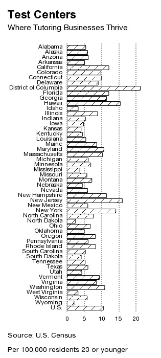 辅导业务更可能出现在人口稠密的州,那里的努力学习的学生密集,家庭愿意支付超过 $200每小时的课程费用。新泽西州每10万名23岁或以下的居民中有16家辅导机构,是所有州中比例最高的。怀俄明州每10万名居民中只有两家辅导中心,是最低的。