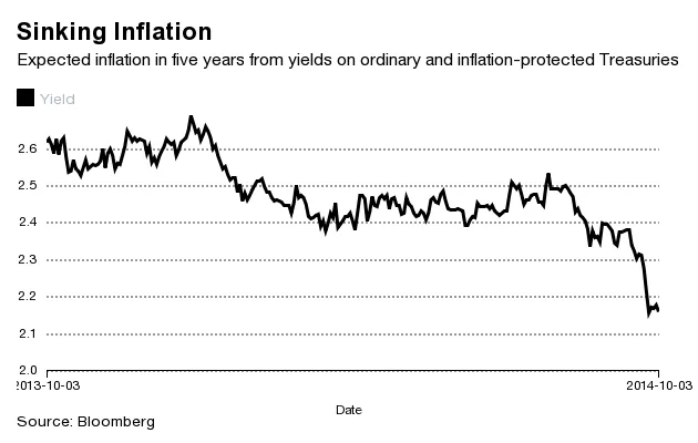 查尔斯·埃文斯,芝加哥联邦储备银行行长摄影:帕特里克·法伦/彭博社非常低的通货膨胀与疲弱的经济增长密切相关,因此债券投资者预计未来五到十年通货膨胀将保持低位,这令人担忧。一个被称为“5年期前瞻5年期通货膨胀 breakeven 率”的预期未来通货膨胀指标在过去几周内急剧下降,这一点在今天的演讲中被查尔斯·埃文斯提到,他是芝加哥联邦储备银行的鸽派行长。