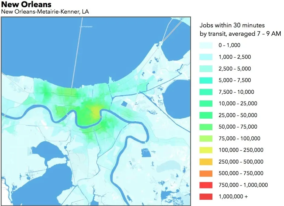 一些城市的趋势正好相反。新奥尔良和奥斯汀就是两个很好的例子。这些城市在10分钟通勤方面分别排名第22和第24。这是有道理的:这两个地方都有非常适合步行的核心区域,而新奥尔良拥有一个电车系统,确实增强了行人通行的便利性。但在60分钟的排名中,这些城市分别降至第38和第41,意味着它们的交通系统在扩展 通达性方面做得并不好,尤其是对于那些不住在市中心的人。