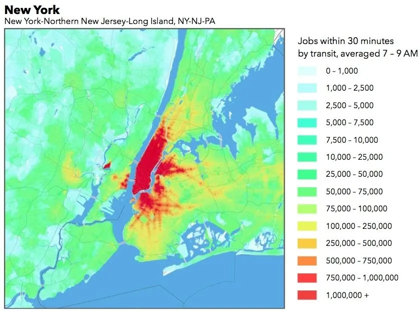 这份名单并不令人感到惊讶,但深入挖掘后,它证明是一个极具洞察力的名单。这些排名使用城市地理和交通时间表来捕捉完整的门到门通勤体验:从到达公交车或火车站的第一英里,到你在那里等待的时间,再到旅行时间本身,最后一英里到达办公室。它们还按时间加权,较短的行程比较长的行程更受青睐。因此,10分钟的通勤比60分钟的通勤给城市带来更多的可达性积分。
