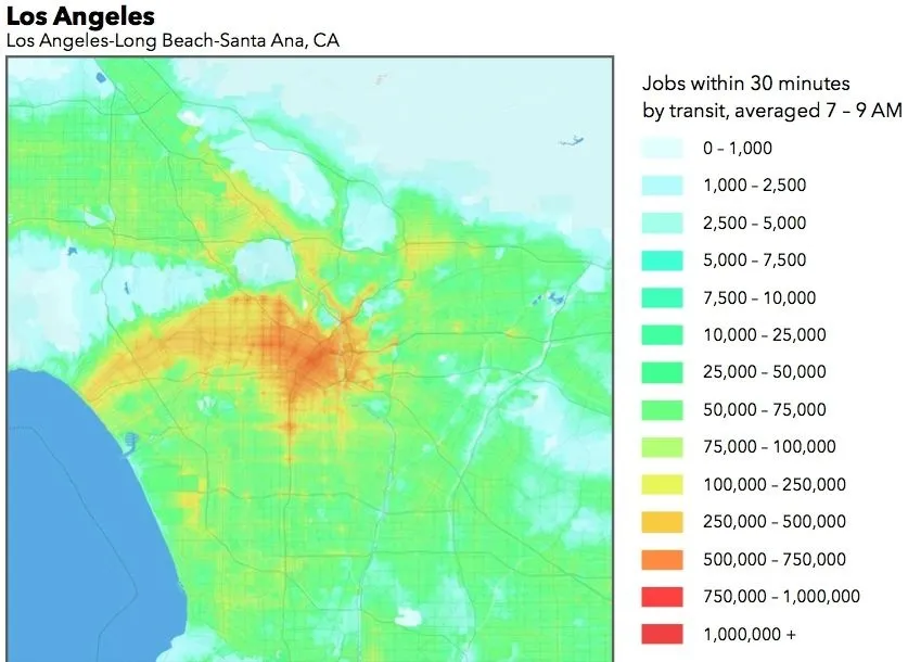 注意:“S. Jose”是加利福尼亚州的圣荷西。城市实验室这些排名中尤其有趣的是,一些城市的排名会根据理想的通勤时间而上升或下降。例如,洛杉矶在10分钟通勤可达性中排名第7,但在60分钟可达性中上升到第2。这告诉我们一个我们已经知道的事情:洛杉矶并不完全拥有一个 密集、可步行的核心。这也告诉我们一个我们常常未能意识到的事情,那就是这座城市拥有一个相当庞大且可靠的公共交通系统(至少按照美国的标准),以及多个工作中心。