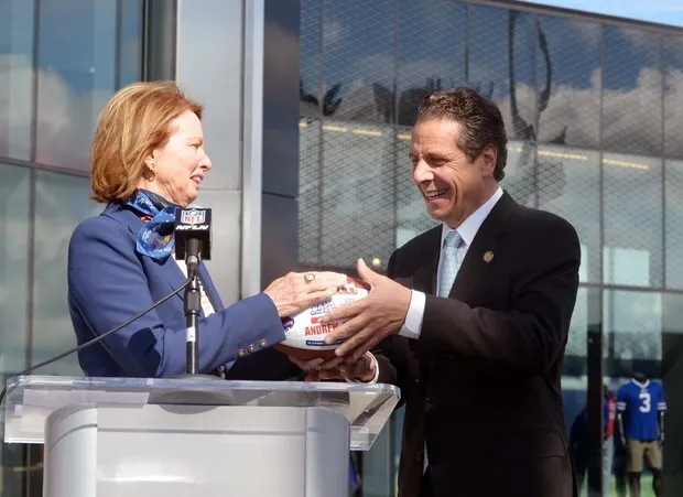 已故布法罗比尔队老板拉尔夫·威尔逊的妻子玛丽·威尔逊在2014年9月14日星期日的拉尔夫·威尔逊体育场翻新剪彩仪式上,将一只足球递给纽约州州长安德鲁·库莫,地点在纽约奥查德公园。美联社照片/加里·维佩特虽然这一慈善惊喜得到了政治家和社区领袖的赞扬,但值得记住的是,威尔逊受益于 有利的体育场租约,这些租约需要数百万公共资金,同时在球队存在的任何时候几乎没有缓解搬迁的恐惧——这些恐惧在 球队的头十年内就已植入。