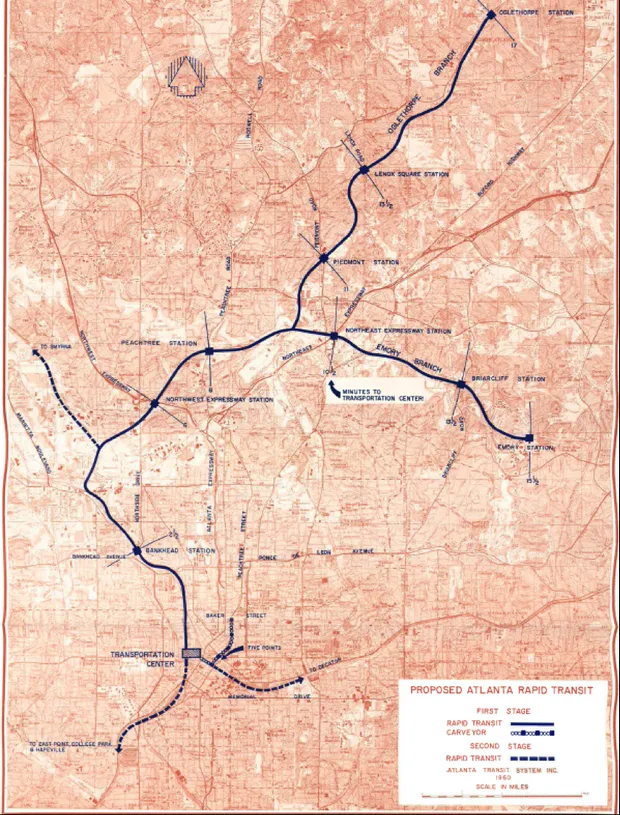 亚特兰大的交通提案展示了持续的郊区抵制如何改变一个地区的长期发展。1960年,由私人公司亚特兰大交通系统公司创建的早期交通地图(如下)提出了一种快速铁路系统,该系统将从亚特兰大市中心的“交通中心”向北延伸至奥格尔索普,向东北延伸至埃默里大学。初始阶段将系统限制在富尔顿县和德卡尔布县。提议的第二阶段将服务扩展到西北的科布县和南部的克莱顿县。东北的格温内特县未包含在任何阶段中。亚特兰大交通公司希望该计划能说服乔治亚州使其成为该市首个公共交通管理局的运营商。