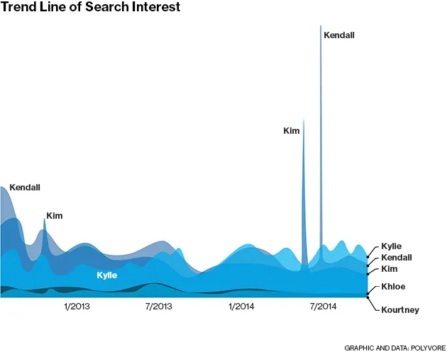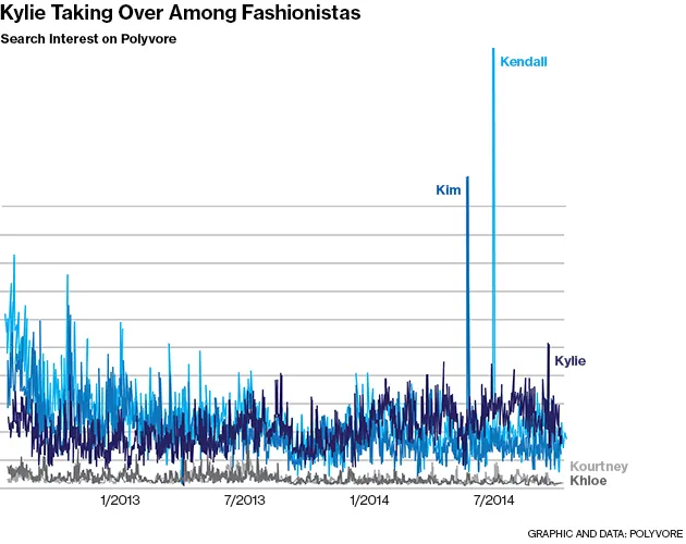 根据时尚网站Polyvore提供的数据,对其每月2000万独立用户的分析显示,凯莉在过去两年中与她的姐妹相比逐渐上升。作为18至24岁女性的避风港,Polyvore的用户代表了时尚行业边缘的购物者——以及那些有父母支付信用卡的人。以下是自2012年7月以来五姐妹的每日搜索兴趣。你可以看到两个高峰出现在金与坎耶·韦斯特的婚礼和肯达尔在纽约时装周期间作为新兴模特的工作时: