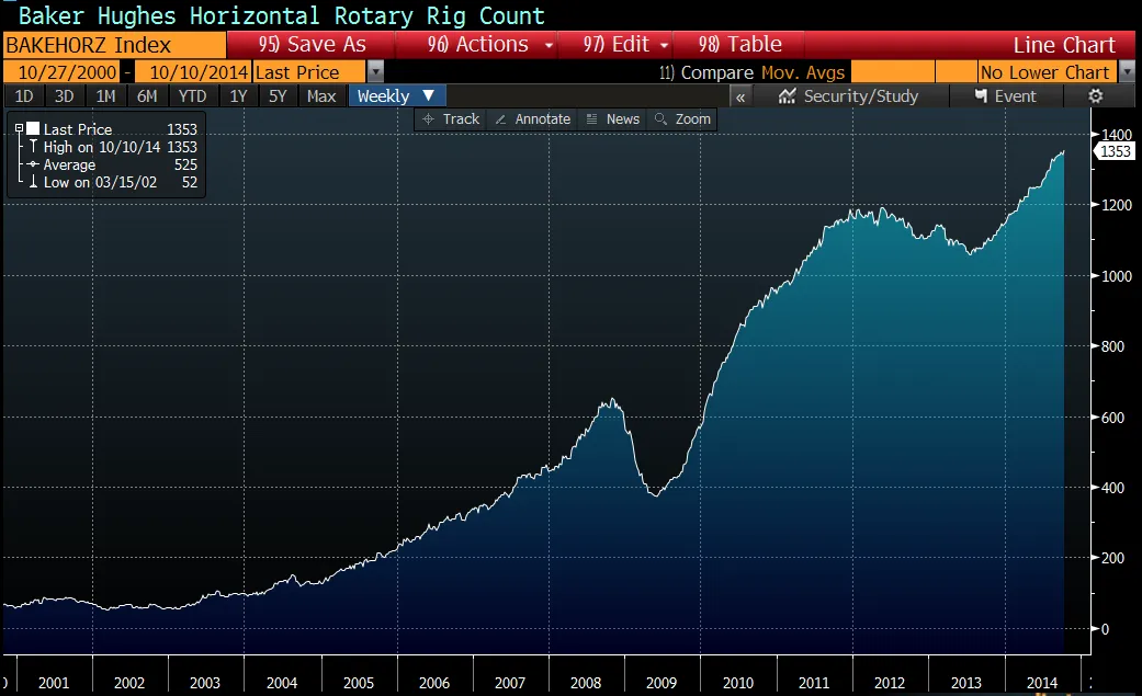 在某种程度上,美国的石油公司通过继续钻探并将美国石油生产推向历史最快的速度,正在延续这一崩溃。钻探者并没有希望通过减少市场供应来提升价格,而是全力以赴,尽可能快地抽取石油。看看现场的水平钻井平台数量: