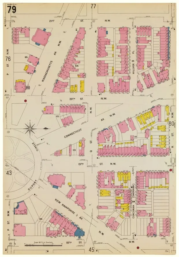 1913年华盛顿特区地图国会图书馆更详细的地图(如下面的杜邦圈地图)揭示了更多内容,特别是楼层数量和单位类型。与今天繁忙的杜邦圈相比,“这里结构的稀疏性确实很突出,”卡普兰谈到下面的1903年地图时说。