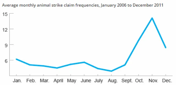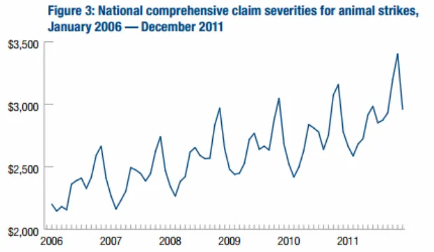 HLDI 还发现,鹿撞事故变得越来越严重。该组织的研究发现,虽然索赔严重程度遵循与整体动物撞击率相同的季节性模式,但在 2006 年至 2011 年间,索赔变得更加昂贵——事故可能也更加严重。在 2006 年,索赔平均为 2,697 美元。到 2011 年,索赔增加了整整 9%,达到了 2,898 美元。