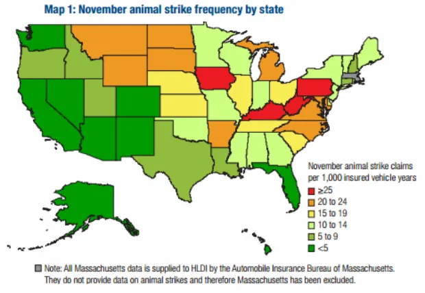 与此同时,像加利福尼亚州、夏威夷州、新墨西哥州和佛罗里达州这样相对稀少的鹿类州,在HLDI研究期间的11月,每千辆投保车辆年内的索赔少于五起。
