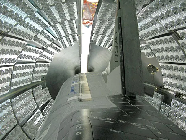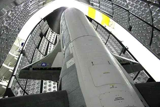 美国空军 X-37B 轨道测试飞行器 于2011年2月8日在佛罗里达州蒂图斯维尔的Astrotech进行封装时的照片。图片来源:美国空军