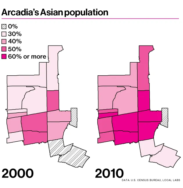 在1903年成立后的近一个世纪里,阿卡迪亚是 白人和保守的。在20世纪30年代末,超过90%的城市房产拥有者签署了由商会传播的协议,只向 白人买家出售房产。它的 圣安妮塔赛马场 在第二次世界大战期间关押了约19,000名日本美国人,他们被迁移到拘留营。在1980年代初,来自台湾的移民涌入,主要是因为优秀的公立学校吸引了他们。1989年天安门广场抗议后,第二波移民来自香港。该市的亚裔人口从1980年的4%增长到2010年的59%。起初存在紧张关系——一封信在当地报纸上赞扬了一项提议禁止非英语店面的计划,写道:“请把你的亚洲标志留在老家,变得美国化。”随着时间的推移,新居民参与了市民生活,加入了扶轮社,进入地方政府,并开设了如鼎泰丰饺子馆这样的商店,这是一家位于购物中心角落的台湾餐厅。