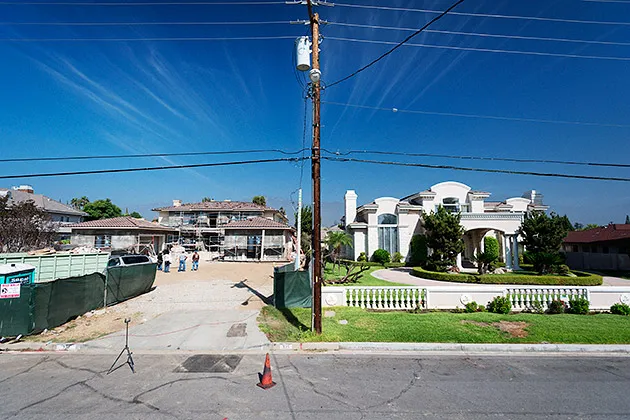 然后是炮的事件。那场争斗发生在西拉斯弗洛雷斯大道上,这里有一排混合着老房子和新建筑的街区,包括由Huy Fong辣椒酱大亨大卫·陈拥有的一栋房子。一个家庭在2008年搬进新家,并在前人行道两侧放置了两座腰高的狮子雕像,这些“福犬”守护着中国皇宫。几年后,一位名叫Ricky Tang的开发商开始在街对面建造自己的房子。Tang不喜欢这些狮子,但它们的主人拒绝将其移除。根据市政记录,2011年1月,Tang在他地块前面的一个施工拖车上安装了两门复制炮,瞄准狮子。每门炮上悬挂着一块用中文写的“对狗的炮”的红色标志。“街对面的邻居感到冒犯,”Kasama说。“他觉得它们看起来很具威胁性。”不久,一辆市政府的普锐斯开了过来,闪着灯,官员恳请Tang拆除武器。他在讨价还价一个月后同意了。Tang没有回应评论请求。
