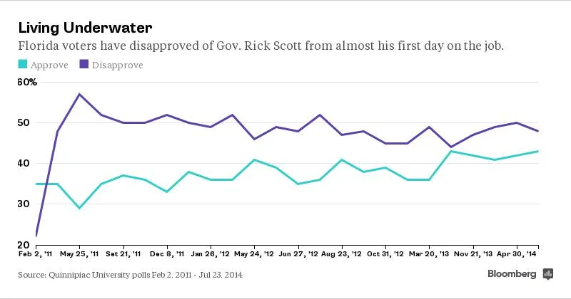 斯科特在堪萨斯城的公共住房中长大,拥有一个真正的白手起家故事,这在经济复苏期间应该是一个政治资产。然而,这反而成了负担。他通过建立美国医院公司赚取了那笔财富,但在公司因医疗保险欺诈被罚款创纪录的17亿美元时,他被迫离开。对于一个医疗保险受益者比例最高的州来说,这并不是一个响亮的支持。由于这一丑闻,斯科特有着一个不寻常的身份,那就是治理一个曾经起诉过他的州。(佛罗里达州在HCA事件中指控斯科特内幕交易,最终该诉讼被搁置,转而支持一个更大的联邦案件。)