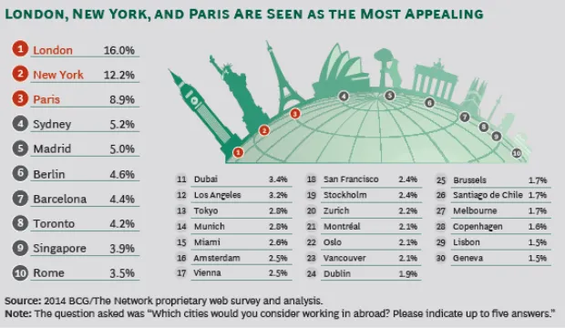 彭博社城市实验室休斯顿附近的管道火灾迫使一些居民撤离伦敦市长计划将繁忙的牛津街步行化中国的电动车革命使贫困的农村城市被抛在了后面旅游布达佩斯区投票禁止类似Airbnb的租赁一项 新的研究 上周由波士顿咨询集团(BCG)和招聘公司The Network发布,识别了全球人才的领先城市。该研究基于来自189个国家的超过203,000人的调查反馈,基于在线和电子邮件查询。具体而言,该研究要求受访者指出他们“考虑在国外生活”的最多五个城市。