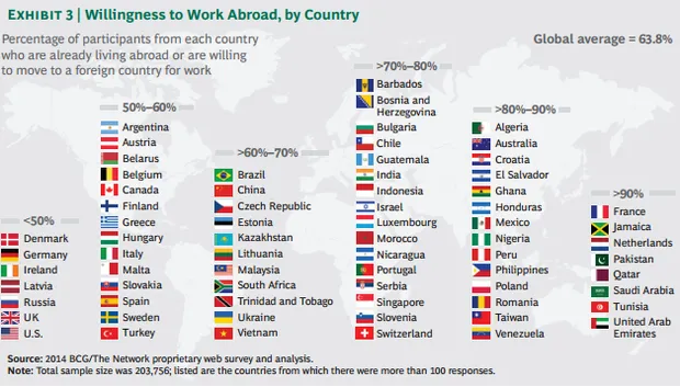 总体而言,研究发现有很大比例的受访者——64%,几乎三分之二——愿意为了工作而移居国外。但它发现,优秀人才愿意迁移的程度因他们目前居住和工作的国家而有显著差异,如下图(同样来自研究)所示。