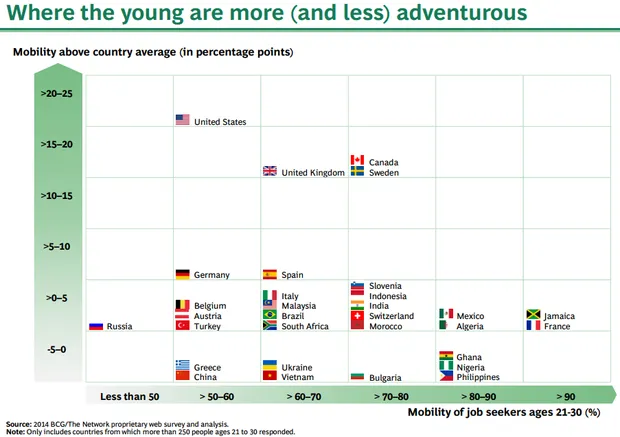 研究还确定了21至30岁年轻工人考虑移居国外工作的百分比。现在模式发生变化,如下图所示。特别是,年轻的美国人比他们年长的同胞更愿意出国。