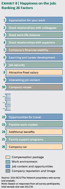 排名最高的因素与具有挑战性的工作和引人入胜的工作环境关系更大。前四个因素是:对工作的欣赏、与同事的良好关系、良好的工作与生活平衡,以及与上司的良好关系。相反,工作幸福感中四个最不重要的因素中有两个与薪酬有关。