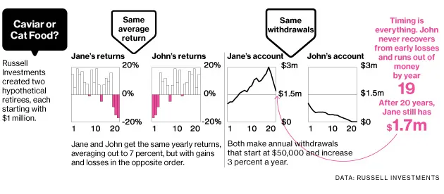 在市场经历几年的糟糕表现之前或之后停止工作的退休人员可能会遭受他们养老金的永久性损害。为了说明这个问题,罗素投资公司创建了两个假设的退休人员,他们各自拥有100万美元的账户;在20年内平均获得7%的投资回报;并且每年提取相同的金额,从5万美元开始,每年增加3%以跟上通货膨胀。其中一位退休人员在早期的回报大多是正的,而损失集中在后期,20年后留下了170万美元。另一位退休人员则在相反的顺序中获得相同的年回报,到了第19年就耗尽了资金。