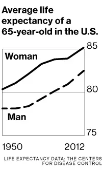 更增加了不确定性的是,人们的寿命在延长。根据本月美国疾病控制和预防中心发布的2012年数据,65岁时的美国男性平均还会再活17.9年,而女性则会再活20.5年。自2002年以来,65岁时的平均预期寿命男性增加了10%,女性增加了7%。随着越来越多的工人退休时没有确定福利计划,且预期寿命持续增加,这个问题在未来几十年将变得更加明显。