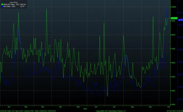 可以肯定的是,随着投资者对从埃博拉到油价暴跌,再到欧洲经济疲软等一系列因素感到紧张,最近交易活动和波动性都在上升。下面的蓝线是VIX指数,衡量预期波动性。绿色线捕捉了所有美国交易所的交易量。