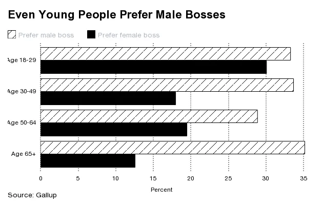 虽然可能会认为随着年轻一代的崛起,这一趋势会发生变化。然而,盖洛普的数据表明,许多颠覆世界的千禧一代仍然宁愿不让女性掌权。