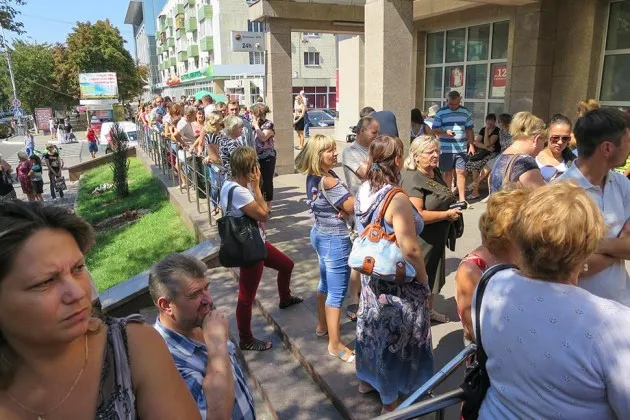 马里乌波尔的居民在乌克兰的银行排队取款,时间是9月5日照片由EPA/Corbis提供早上9:30,基辅市中心的Oshchad银行的兑换柜台周围已经开始聚集人群。“如果你想排在第一位,最好在早上8:00之前到这里,”一名员工嘟囔着。过去几天,这家银行分行是乌克兰首都为数不多的几家愿意且能够将乌克兰国家货币格里夫纳兑换成美元的银行之一。