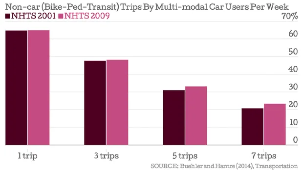 因此,Buehler和Hamre建立了四个阈值来区分不同级别的多模式性:每周一次、三次、五次和七次非汽车出行,此外还有一些驾驶。我们来看一下2009年满足最低多模式阈值的64.9%的受访者,他们每周至少进行一次非汽车出行。正如预期的那样,随着阈值的提高,数字会减少,但仍然令人印象深刻。大约48%的受访者每周至少进行了三次非汽车出行,约33%的受访者每周至少进行了五次。当多模式阈值达到每周七次非汽车出行——平均每天一次——几乎四分之一的受访者仍然达到了这个标准。