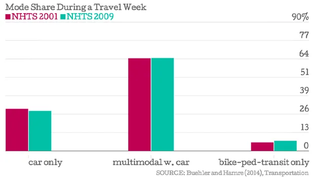 城市实验室所以在任何给定的日子里,很多美国人只开车——这是我们已经非常了解的事情来自通勤趋势。但是每周的习惯揭示了更复杂的出行行为。在这里我们看到,整个星期仅依赖汽车的美国人所占比例明显是少数,两个年份都低于30%,而这些比例也在逐渐下降。没有汽车的旅行者随着时间的推移再次增加。而多模式驾驶者,即在一周内使用汽车加至少一种其他交通方式的人,占所有受访者的近65%。再次,我们绘制了Buehler和Hamre的研究结果: